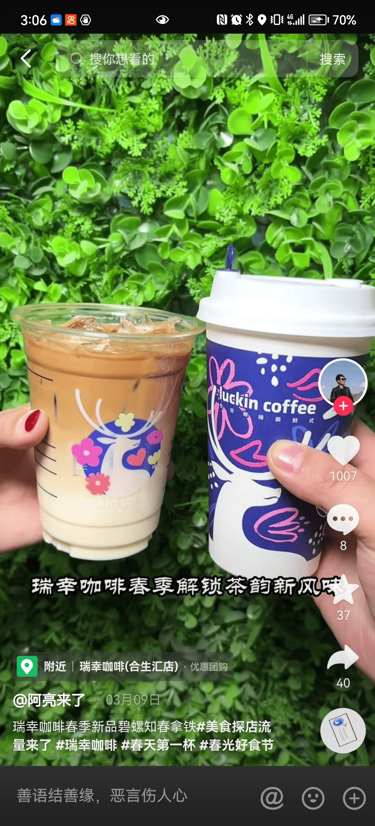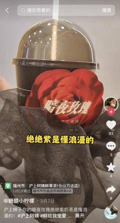 沪上阿姨联合抖音生活服务「春光好食节」营销节点,线上围绕热点话题#奶茶可以这么浪漫的不多,完成了一次“现象级”的新品营销活动。配合春日营销氛围,沪上阿姨重点铺设以优质浪漫为主的种草视频,贴合新品气质的同时,也能为消费者营造满满的节日氛围。为了配合新品内容上线节奏上,将更多资源集中在新品上线5天,联动超过20位高粉达人集中铺设了超过千条种草视频,力求在短时间内迅速引爆新品,达成新品即爆品。新品上市3天售卖超63万杯,达人视频投稿数3万余条,视频总播放量超2亿,抖音站内搜索环比增长超过190%。