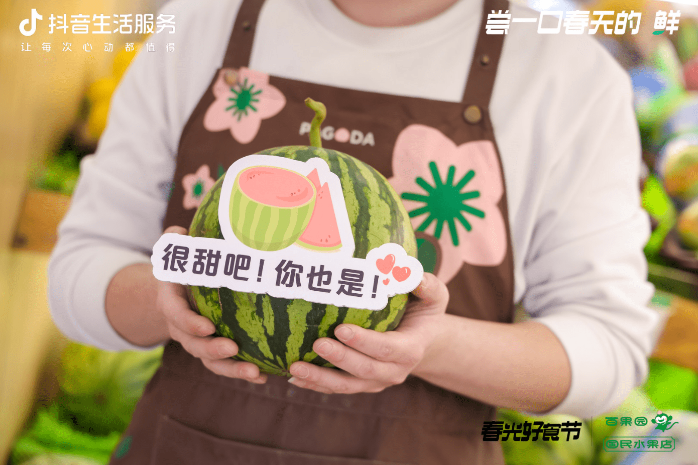 在春日凤梨营销旺季,百果园在上海推出了10家「春光好食节」尝一口春天主题门店,配合抖音上新团品凤梨,线下打造10家快闪店让用户进店随处可见的水果文案与心理鸡汤集合制作手举牌,用吃水果的方式表达自己,吃的不仅仅是水果,也是一种生活态度。线下主题门店推出春季踏青限定打卡物料,线下设置抖音一店一码物料铺设引导ugc打卡,还有戴着可爱水果头套的店员为用户推荐春日好果。让用户行走在春日街头,走进百果园仿佛走进春天的水果世界。